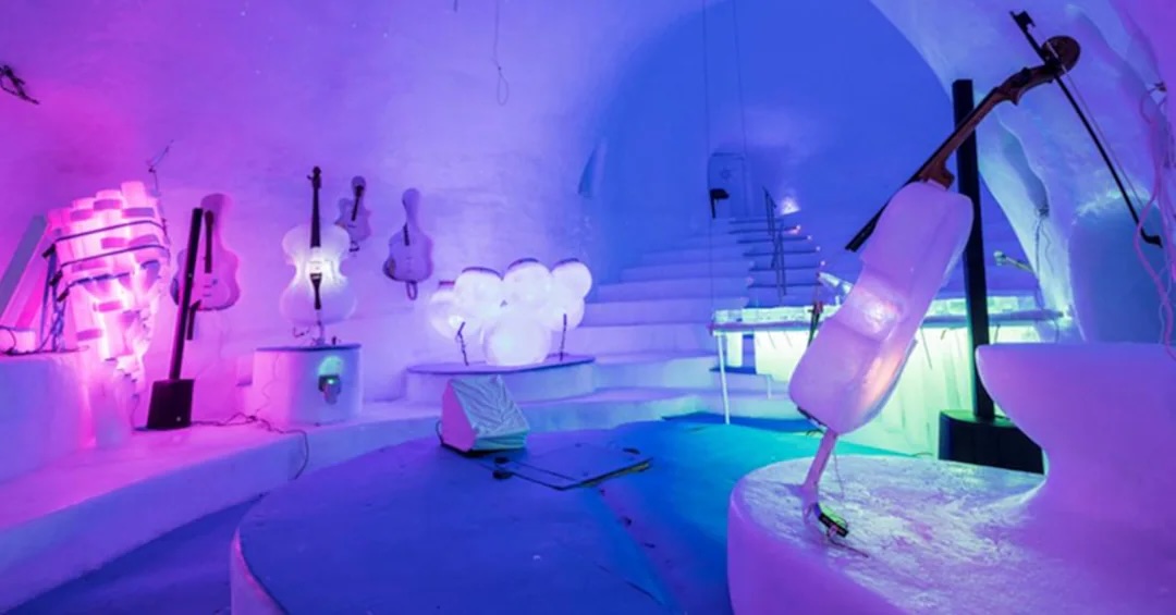 The thrill of a concert in an igloo at 2,600 meters above sea level with instruments made of ice at the Presena Glacier.